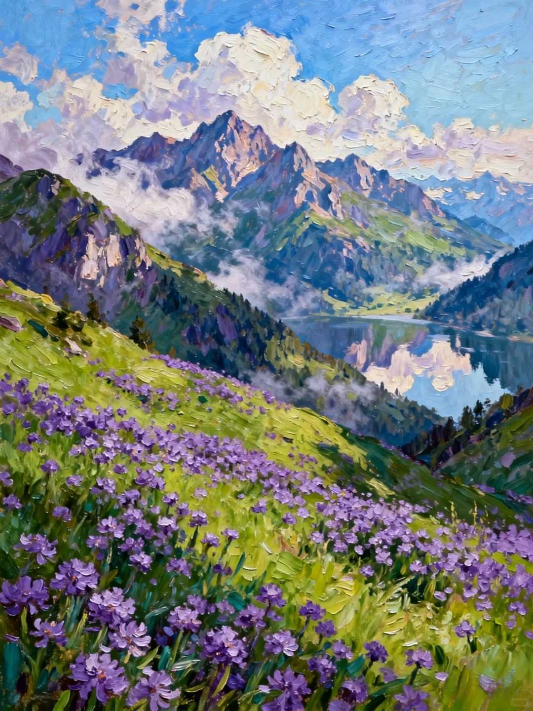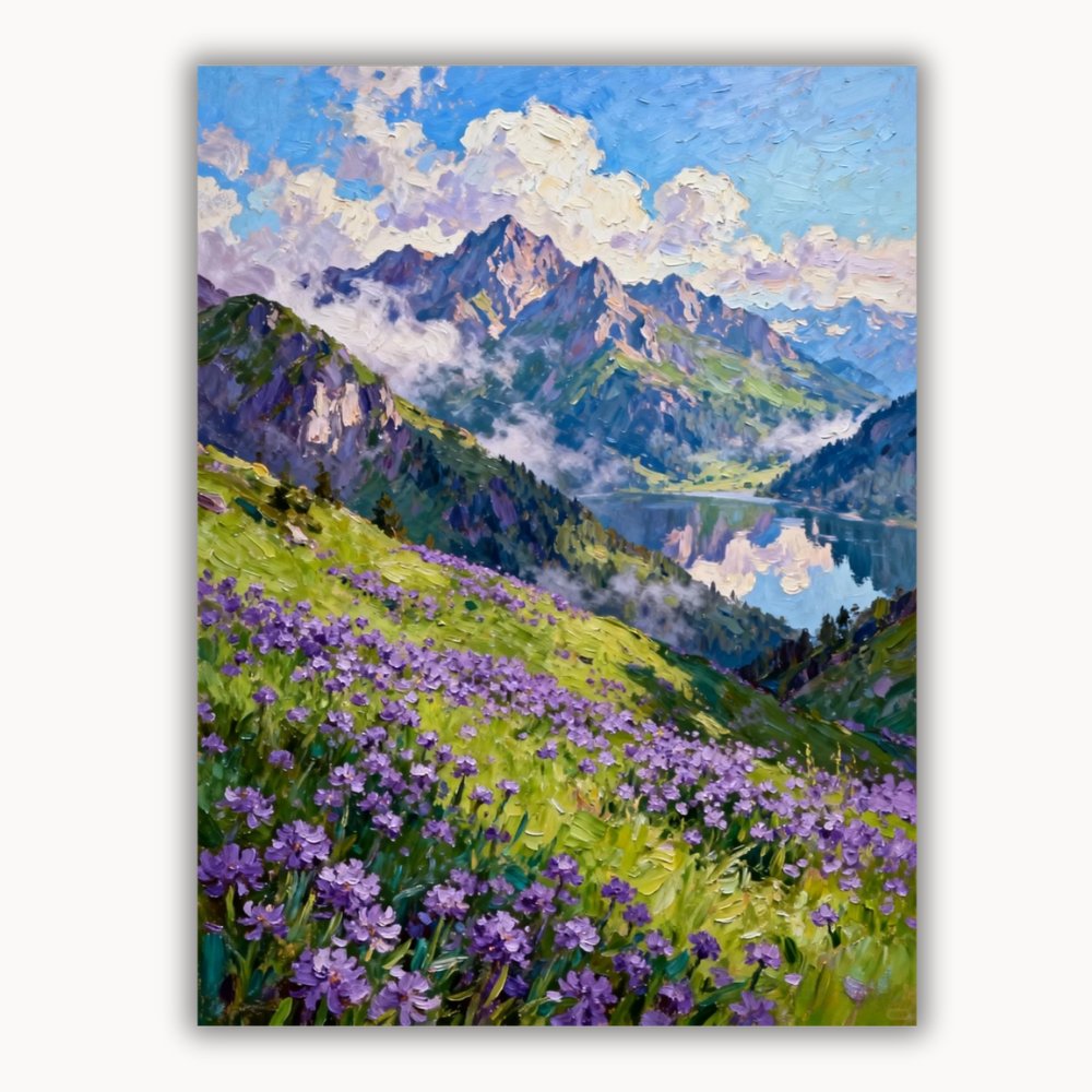 Premium paints, three brushes, linen canvas, paint by numbers guide, color card, and reference sheet.