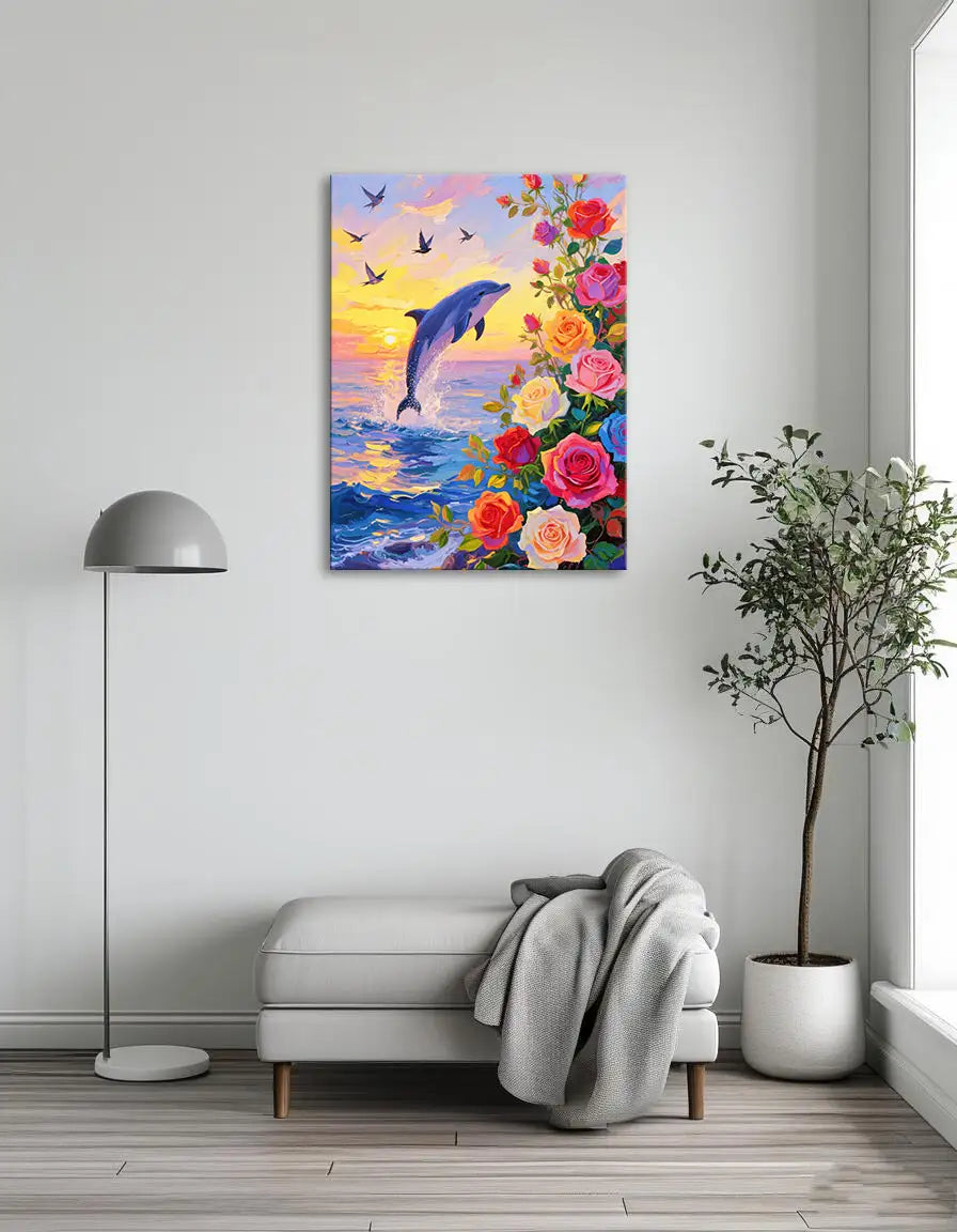 Model: Leaping Dolphins 4 Method: Paint by numbers Difficulty level: Easy Size(s): From16"x20"(40x50cm) Support: Numbered linen canvas Type of paint: Acrylic Packaging: Securely wrapped Packaging